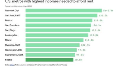 Business & Finance1 Min Read Nine9cronAugust 23, 2025 To Afford Seattle Rent, You Need Nearly $91,000 A Year To Afford Seattle Rent, You Need Nearly $91,000 A Year Renting in Seattle now requires a much higher income than just a few years ago,…
