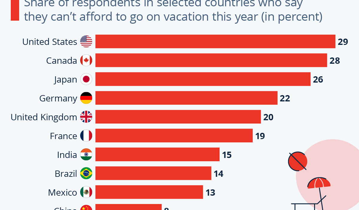 As the infographic also shows, China was the only country where fewer than 10 percent of the respondents couldn’t afford a holiday this year, far fewer than in Germany (22 percent), France (19 percent) or even Japan (26 percent).