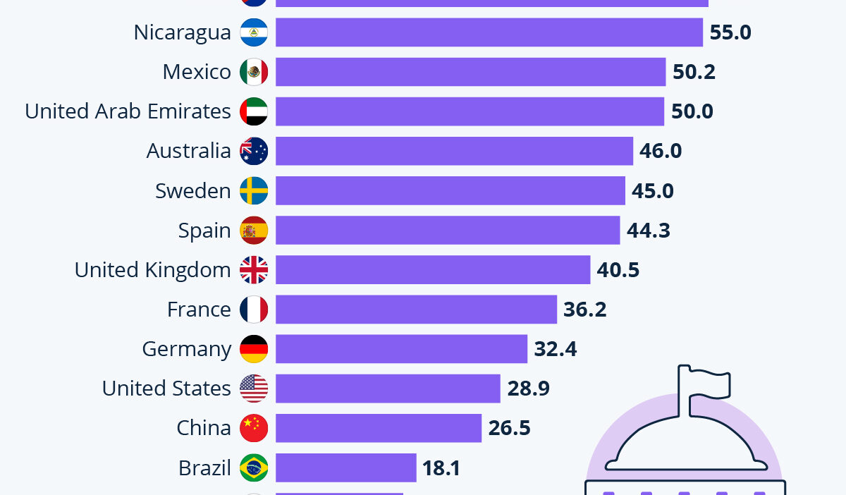 In Europe, Scandinavian nations lead, like Sweden at 45 percent, Finland at 45.5 percent and Iceland at 46 percent. Spain follows suit with 44.3 percent.