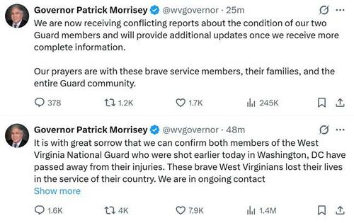 Update: The West Virginia governor has issued a strange backtrack after minutes prior to announcing the guard members who were shot were “confirmed dead”. He now cites “conflicting reports” of their condition. A shooter is in custody. Hopefully, they have survived.