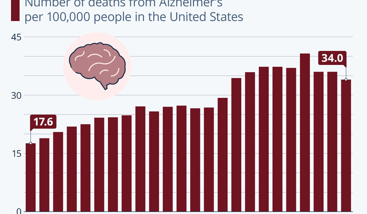 As Statista’s Anna Fleck shows in the chart below, where an average of 17.6 people per 100,000 died from the form of dementia at the turn of the millennium, the figure had climbed to 34 per 100,000 people as of 2023.