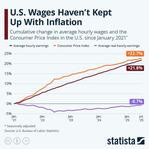 According to data from the U.S. Bureau of Labor Statistics and visualized by Statista, average hourly earnings increased by 21.8% from January 2021 to July 2025.