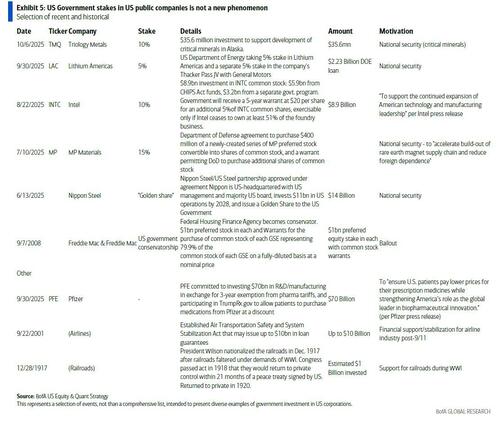 Indeed, as Bank of America shows, in just the past few weeks the US government had taken equity stakes in tech, pharma, rare earths and metals (as an side, the US government investing in stocks is not a new phenomenon, but has been more prevalent for bailouts than strategic investments in recent decade).