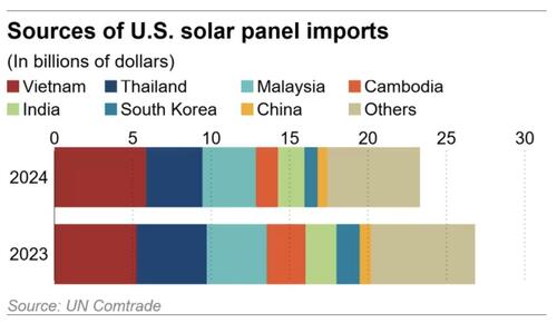 But Nikkei writes that growth ended after U.S. tariff policy shifted. The Biden administration had granted a two-year waiver on tariffs, but when it expired in mid-2024, the Trump administration imposed duties ranging from 534% to 3,403% on Cambodian solar modules. By comparison, tariffs on Malaysia, Thailand, and Vietnam were lower. The result was immediate: Cambodian solar exports fell to just $4.4 million in the first half of this year, according to customs data.