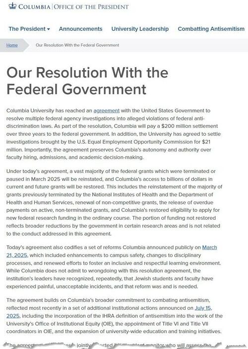 “While Columbia does not admit to wrongdoing with this resolution agreement, the institution’s leaders have recognized, repeatedly, that Jewish students and faculty have experienced painful, unacceptable incidents, and that reform was and is needed,” the university said in a statement announcing that it had reached a deal with the federal government.