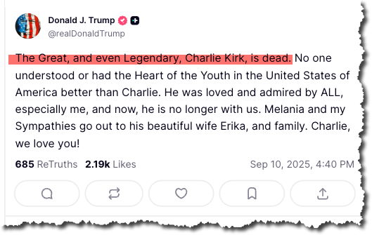 • Trump states on Truth Social that Charlie Kirk has died.