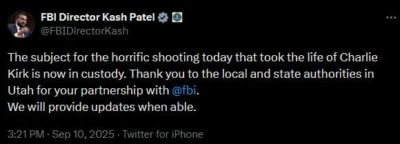 Update (2015ET): 90 minutes after FBI Director Kash Patel announced that a suspect in the Charlie Kirk assassination was in custody, the suspect was released and the shooter remains at large.