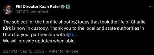 Update (1830ET): FBI Director Kash Patel announced moments ago that “The subject for the horrific shooting today that took the life of Charlie Kirk is now in custody” (we assume he means ‘suspect’).
