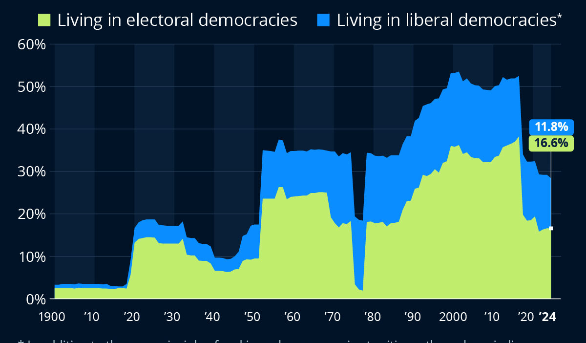 By 2024, just 28 percent of the world’s population, or 2.3 billion people, lived in electoral or liberal democracies, down from almost 4 billion people in 2016.