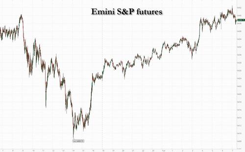 US equity futures are up again, and set for a 7th consecutive record high into a heavy earnings day and ahead of tomorrow’s Fed decision as attention turns from trade deals to company results and economic data to justify nosebleed valuations. As of 8:00am, S&P futures are 0.2% higher after the index hit its latest record high on Monday; tech is outperforming again and Nasdaq 100 contracts up 0.5%. In pre-market trading, Mag7, Semis, and Cyclicals are outperforming. Bond yields are lower (10Y yield at 4.3919%, down 2bps) as the USD rally is poised to continue after the dollar climbed to its strongest level in more than five weeks on speculation a slew of readings on the economy will show the tariff impact is contained. Commodities are mixed with energy leading on US / RU geopolitics. The macro data focus today includes JOLTS, Housing Prices, regional Fed activity indicators, trade data, inventories, and consumer confidence.
