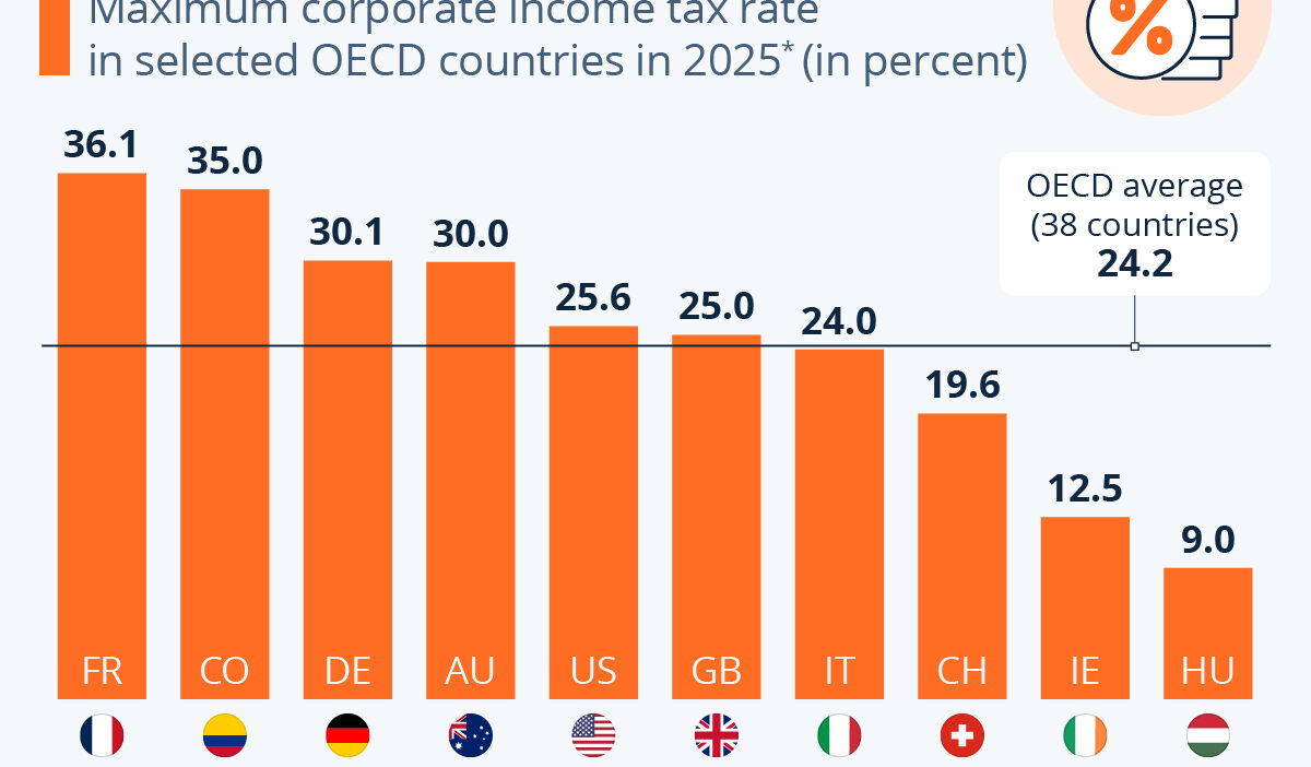 As Statista’s Tristan Gaudiant details below, using the organization’s data, France maintains the highest combined corporate tax rate in the OECD, at 36.1 percent in 2025, followed by Colombia (35 percent), while the lowest marginal corporate tax rate is found in Hungary, at 9 percent, followed by Ireland (12.5 percent).