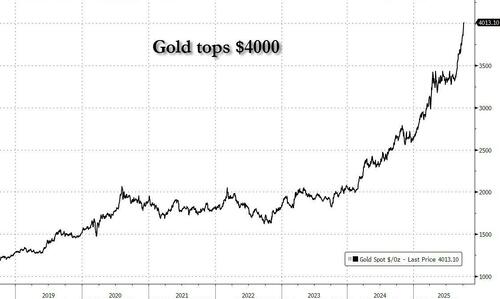 Gold has just topped the $4,000/oz level for the first time ever, cementing its status as the year’s best performing asset and most intriguing story in global commodities, not to mention the most important themes across broader financial markets – one of accelerating and relentless fiat destruction coupled with what Rabobank earlier today called passing the global fiscal event horizon (read letting inflation run amok in hopes of inflating away the $330 trillion in global debt).