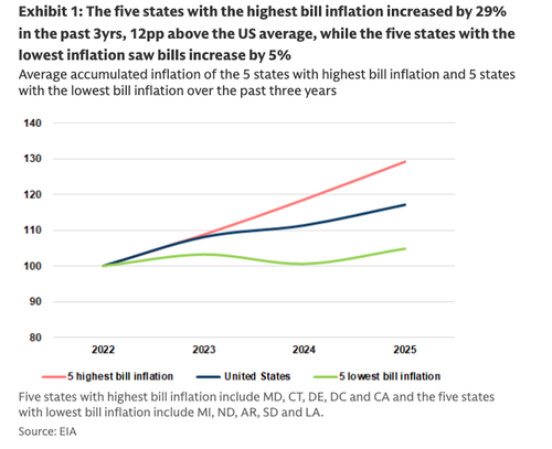 We believe the higher inflation in the Northeast/Mid-Atlantic and California regions are being caused by: (1) tighter regional supply/demand as load growth inflects from electrification, data centers, and reshoring, driving higher capacity prices that are passed onto customers, alongside coal plant retirements, (2) volatility in natural gas prices as well as supply constraints on domestic natural gas flows, (3) public benefits charges that support state/federal mandates around energy efficiency, wildfire mitigation, and clean energy goals, and (4) higher delivery charges, as utilities invest in aging grid infrastructure. In the states that have seen lower inflation, robust local resource availability (coal/wind/gas) have helped keep electricity rates lower given abundant supply.