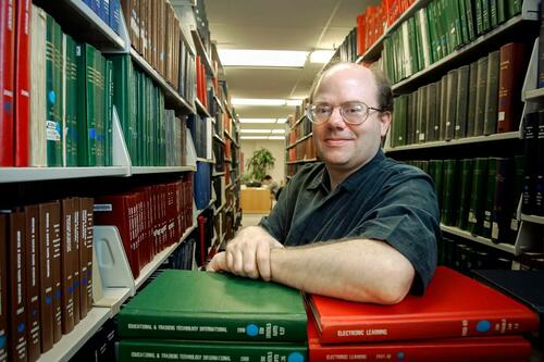 Larry Sanger, co-founder of Wikipedia and former philosophy professor, among stacks of reference books at a library in Columbus, Ohio, on March 26, 2007. Kiichiro Sato/AP Photo