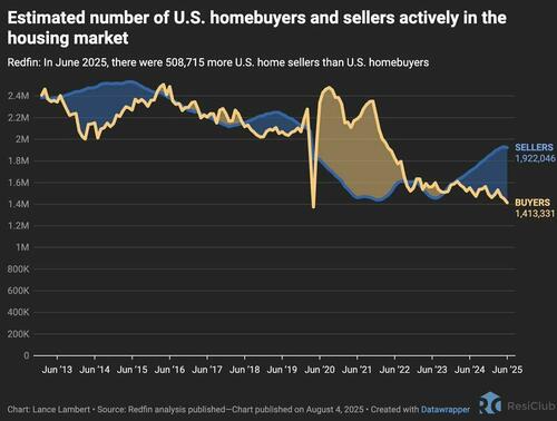 There are an estimated 1.92 million home sellers in the U.S. housing market and about 1.41 million homebuyers. In other words, there are 508,715 more home sellers than buyers, a massive mismatch not seen at any other point in Redfin data going back to 2013.