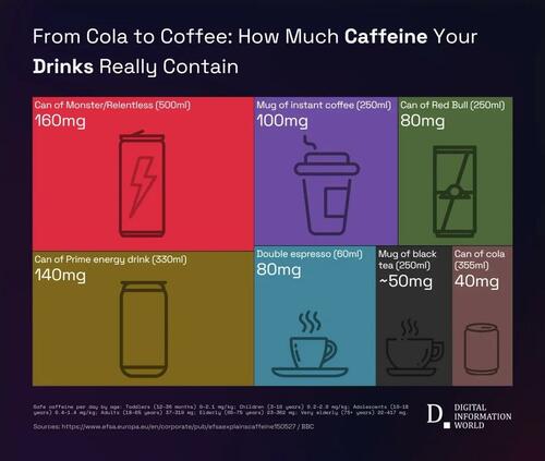 As Visual Capitalist shows in the infographic below, the amount of caffeine in common drinks varies widely: