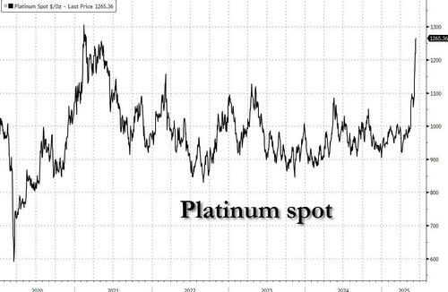 Yesterday, in “What’s Behind The Recent Surge In Platinum, And Will It Continue“, we not only explained in detail what is going on both at the technical and fundamental level, but also answered in the affiramtive and why – yes, it the surge will continue. One day later the surge has indeed continued, and having decisively broken $1200 earlier this week, platinum spiked another $100, touching a session high of $1285, and is now just dollars away from the post-covid high above $1300.
