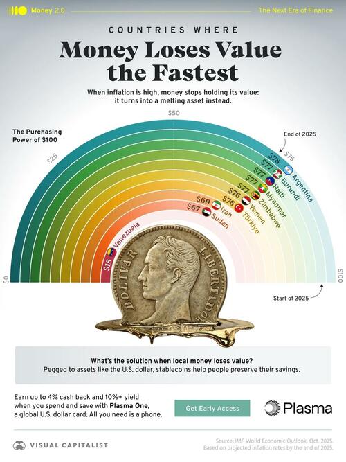 This graphic, created by Visual Capitalist’s Jenna Ross in partnership with Plasma, highlights countries with the highest inflation rates and what $100 could be worth by the end of 2025. It’s part of our Money 2.0 series, where we highlight how finance is evolving into its next era.