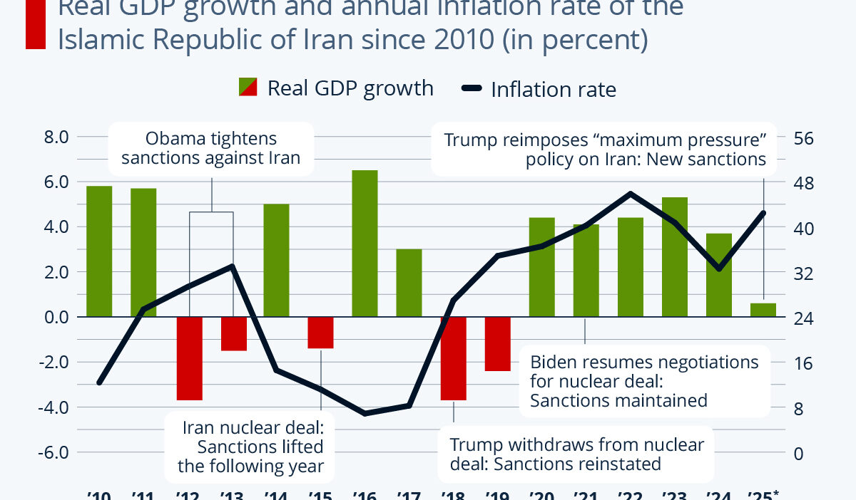 According to the IMF‘s latest projection (October 2025), Iran’s real GDP is expected to grow by just 0.6 percent in 2025, a sharp decline from previous years (+3.7 percent in 2024, +5.3 percent in 2023).