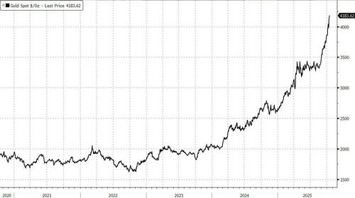 Gold, which traded below $2,000 just two years ago, has outpaced gains in equities so far this year, this decade, and this century, reflecting investor demand for safe-haven assets amid inflation concerns and geopolitical unrest, after ignoring precisely the same arguments presented by “tinfoil hat” conspiracy blows such as this one. It continued its torrid advance on Tuesday, climbing to a record $4,184 an ounce, extending its gain this year to almost 60%.