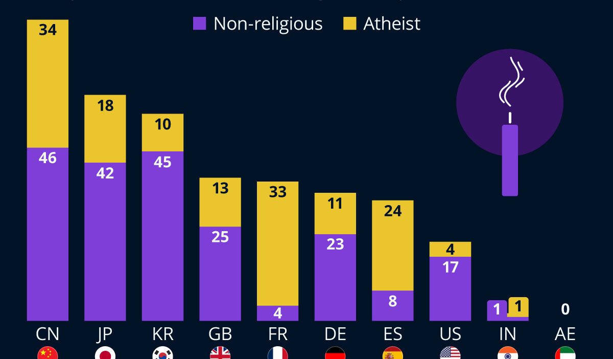 In China, the highest percentage of people among the 32 countries and territories included in the Statista Global Consumer Survey self-identify as non-religious or atheist, the latter group describing people rejecting the idea that there is a God.