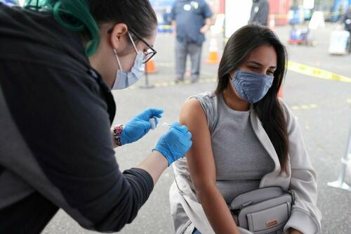 A woman receives a COVID-19 vaccine in Los Angeles, Calif., on March 25, 2021. Lucy Nicholson/Reuters