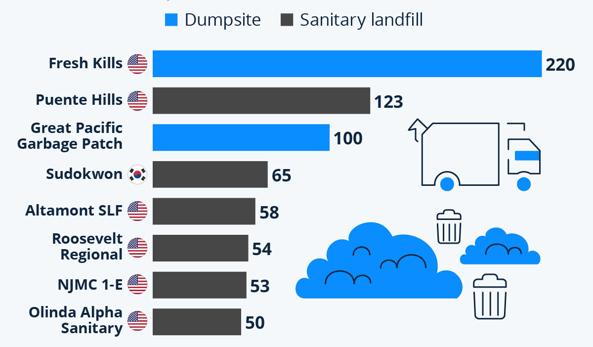 As Statista’s Anna Fleck details below, according to crowdsourced data verified by the collaborative online platform Waste Atlas, the former dumpsite Fresh Kills tops the list. The site is estimated to contain 220 million tonnes of waste, including debris from the September 11 attacks. It closed in 2001 and a public park is now being built on top of it.