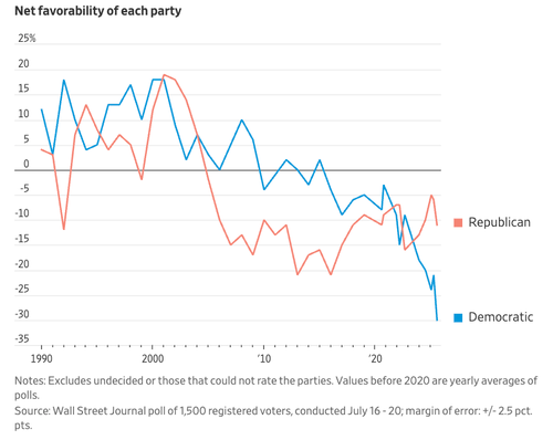 A new Wall Street Journal poll shows the Democratic Party’s image has sunk to its lowest point in over three decades. About 63% of voters hold an unfavorable view of the party, the highest level since the survey began in 1990, while only 33% view it favorably.
