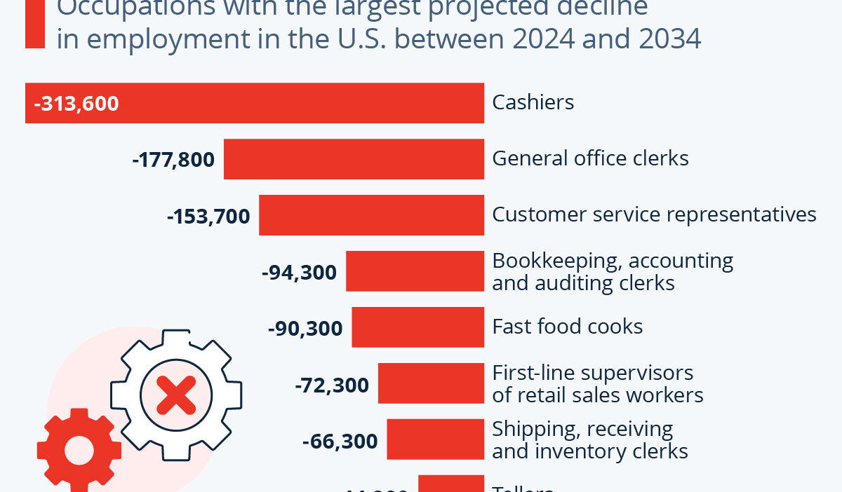 As Statista’s Felix Richter shows in the chart below, based off its latest edition covering the 2024-2034 period, the BLS identified four occupational groups that are projected to lose jobs over the next decade: office and administrative support occupations, production occupations, sales and related occupations as well as occupations in farming, fishing and forestry.