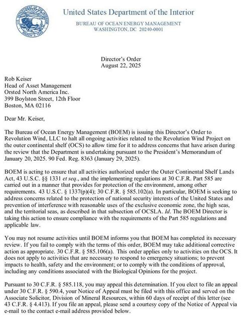 The Interior Department’s Bureau of Ocean Energy Management (BOEM) issued a directive on Friday ordering Orsted to halt all offshore construction activities on the Revolution Wind project. The order stems from a Presidential Memorandum issued on Jan. 20, which triggered a broad review of renewable projects on the Outer Continental Shelf.