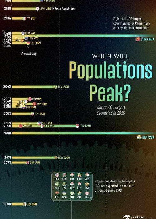 The infographic, via Visual Capitalist’s Pallavi Rao, maps out when the 40 most-populous countries in 2025 will reach their population ceiling—and whether that ceiling is even within this century.