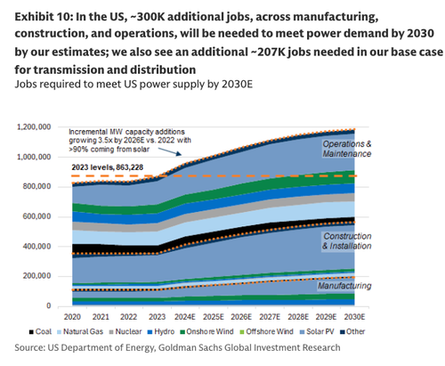 Now, Goldman analysts led by Carly Davenport are telling clients that the power industry will need over 500,000 new workers by 2030 to meet the surging electricity demand from data centers and the broader economy-wide electrification push.