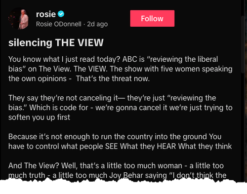 The next domino to potentially fall could be “The View” on ABC. Unfunny and unhinged leftist comedian Rosie O’Donnell posted a lengthy message on TikTok about the show’s imminent demise, which features a panel of leftist women hosts who spend their days screeching anti-Trump rhetoric.