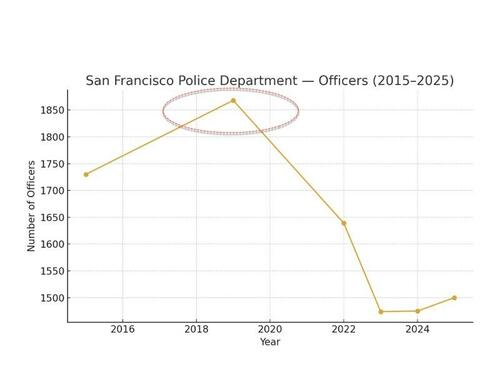 Surprisingly, Benioff has yet to delete this X post, showing the plunge in police officers in the crime-ridden metro area. He did not provide context that the drop began around the time the far-left city leaders pushed “defund the police” and continued other failed criminal and social justice reforms.