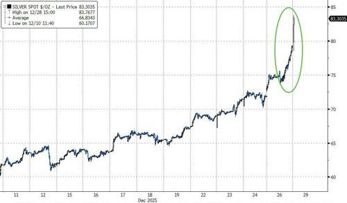 The final week of the year begins with silver adding to a stunning month of gains, topping $83 for the first time…