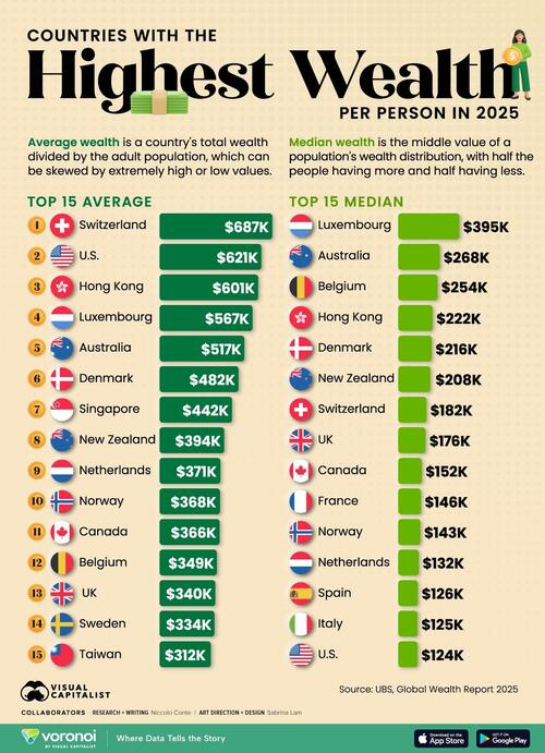 This visualization, via Visual Capitalist’s Niccolo Conte, ranks the top 15 countries by average and median wealth per person, based on data from the UBS Global Wealth Report 2025.