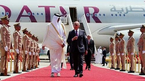 Iraqi Foreign Minister Fuad Hussein (right) walks with Qatari Emir Tamim bin Hamad Al Thani (left) upon his arrival in Baghdad for the 34th Arab League summit on 17 May 2025
