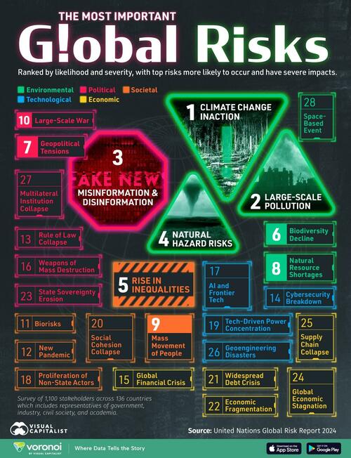 This visualization, via Visual Capitalist’s Kayla Zhu, shows the top 28 most important global risk as outlined in the United Nations Global Risk Report 2024.