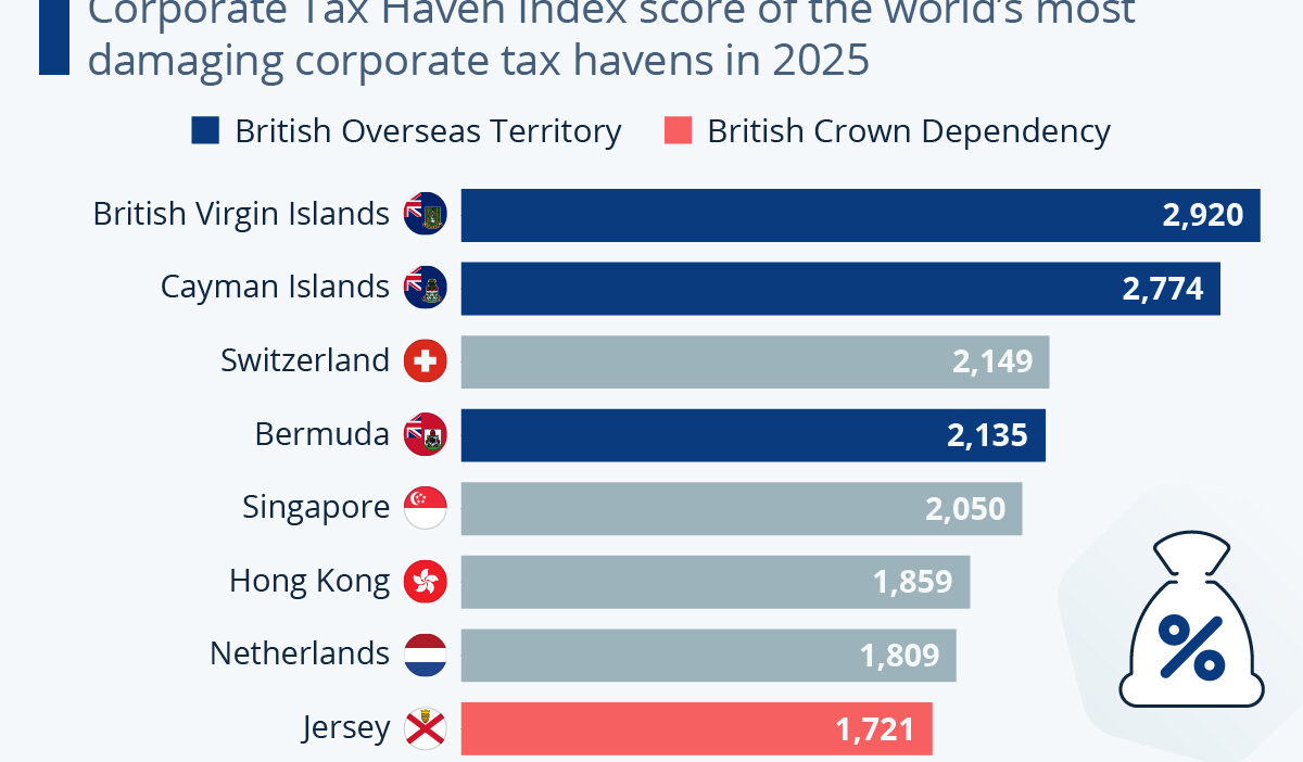As Statista’s Anna Fleck shows in this infographic, British overseas territories and crown dependencies dominate the top eight roundup of places allowing multinationals to avoid paying tax on their profits.