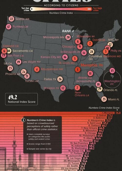 At the top of the list, Memphis, Tennessee registers the highest crime index score at 78, marking it as the city Americans perceive as the most unsafe in 2025.