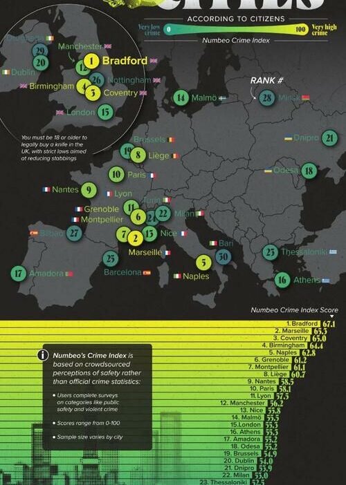 Four of the top five cities — BradfordCoventryBirmingham, and London — are located in the United Kingdom. Bradford leads the list with a Crime Index of 67.1, the highest in Europe.