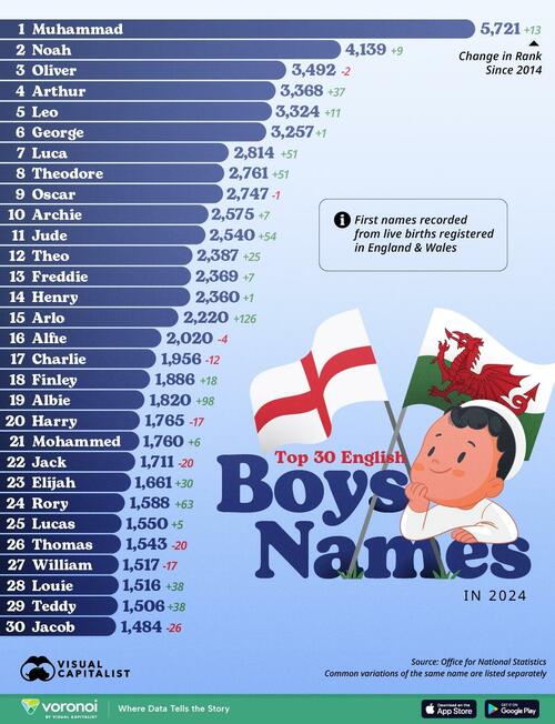 This visualization, via Visual; Capitalist’s Pallavi Rao, ranks the thirty most popular names for boys registered in England and Wales last year, spotlighting newcomers and chart-toppers alike.