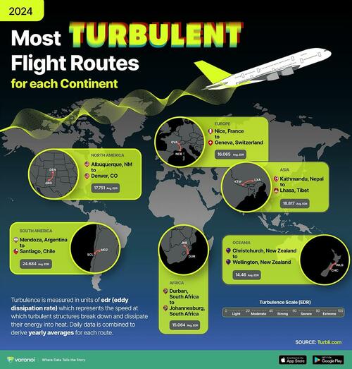The visual below, created by Julie Peasley via Visual Capitalist, maps the single most turbulent flight route on each continent using Turbli’s 2024 rankings.