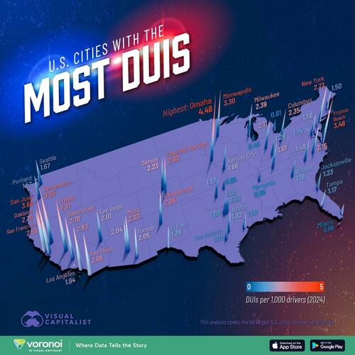 In this visualization, Visual Capitalist’s Marcus Lu shows the rate of DUIs per 1,000 drivers across America’s 50 biggest cities, based on an analysis conducted by LendingTree.