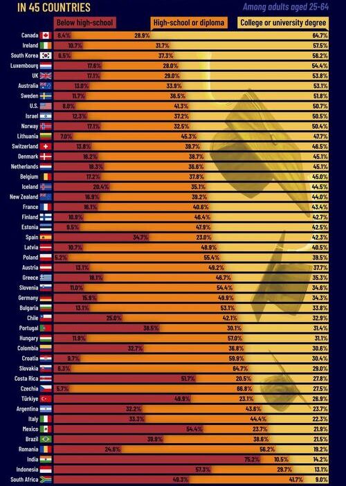 This data comes from the OECD’s Education at a Glance 2025 report. It compares educational attainment among working-age adults across 45 countries as of 2024.