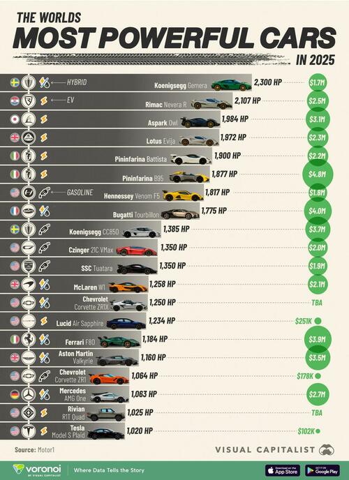 In this infographic, Visual Capitalist’s Marcus Lu ranks the 20 most powerful cars of 2025, spanning gasoline, hybrid, and fully electric powertrains.