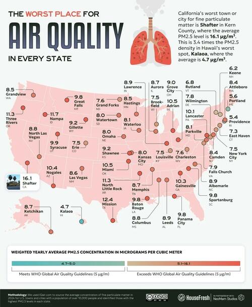 To do this, they sourced the average PM2.5 concentrations from IQAir for all available U.S. cities and towns in 2024.