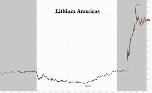 One week after Bloomberg reported that the White House was considering a 10% stake in one of the largest North American lithium mining companies, Lithium Americas, on Tuesday afternoon, the US government agreed to acquire a stake in the company, Secretary of Energy Chris Wright said Tuesday on Bloomberg TV, giving a boost to the Canadian company as it develops its Thacker Pass lithium project in Nevada.
