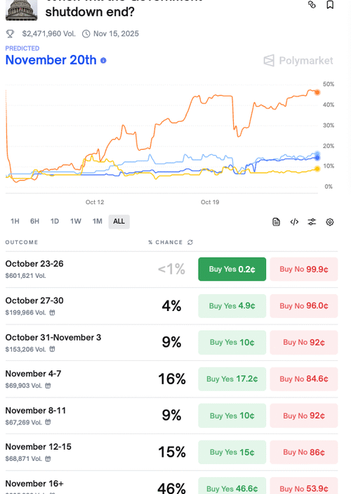 The federal government shutdown entered Day 25 on Saturday, with cryptocurrency-based prediction market Polymarket showing odds in the single digits that Democrats and Republicans will reach a resolution before November 3. The market currently assigns a 15% probability that the shutdown will end between November 12 and 15.