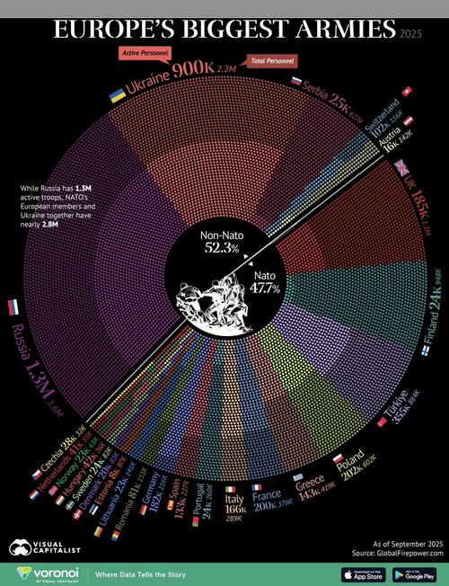 This visualization, via Visual Capitalist’s Bruno Venditti, breaks down the estimated size of military forces across Europe in 2025. It covers both active personnel and total military strength, which includes reserves and paramilitary units. The data for this visualization comes from GlobalFirepower. Countries are also categorized by NATO membership.